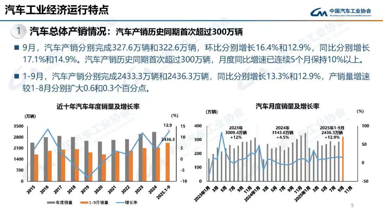 10月14日,中汽协发布了9月的汽车工业产销情况。9月份,我国汽车产销分别完成327.6万辆和322.6万辆,同比分别增长17.1%和14.9%,月度同比增速已经连续5个月保持10%以上。1-9月,我国汽车产销分别完成2433.3万辆和2436.3万辆,同比分别增长13.3%和12.9%。和9月销量数据一起出炉的,还有数十家车企前三季度的销量完成情况。